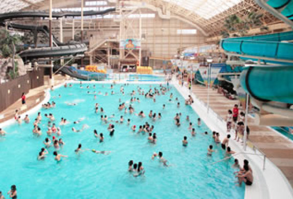 いわき市の温泉施設、スパリゾートハワイアンズにあるボディスライダー「ビッグアロハ」は長さ283m、高低差40.5mともに日本一。高さは9階建てのビルに相当しスリル満点。